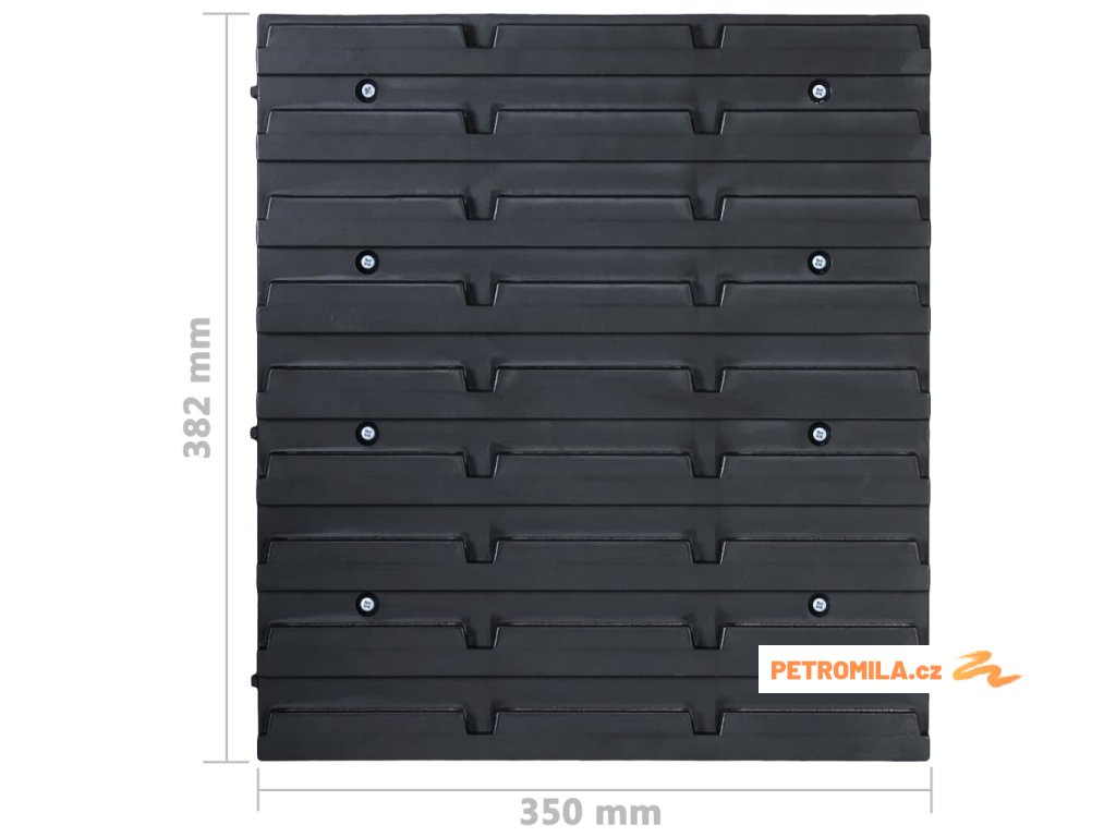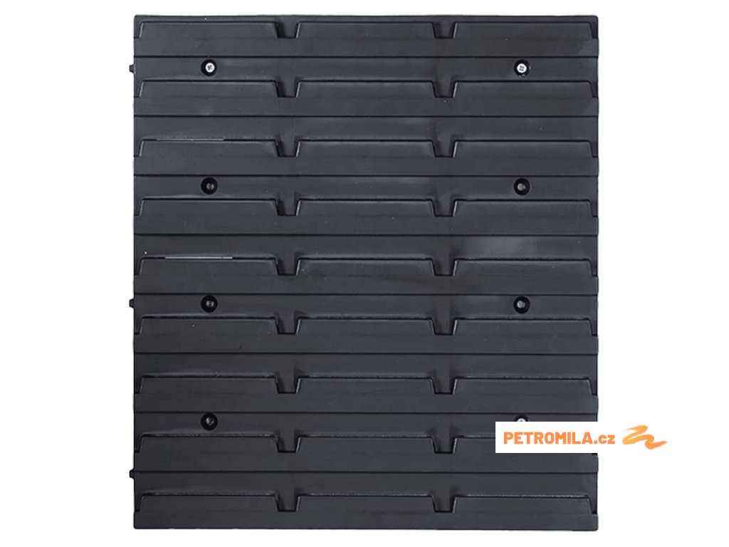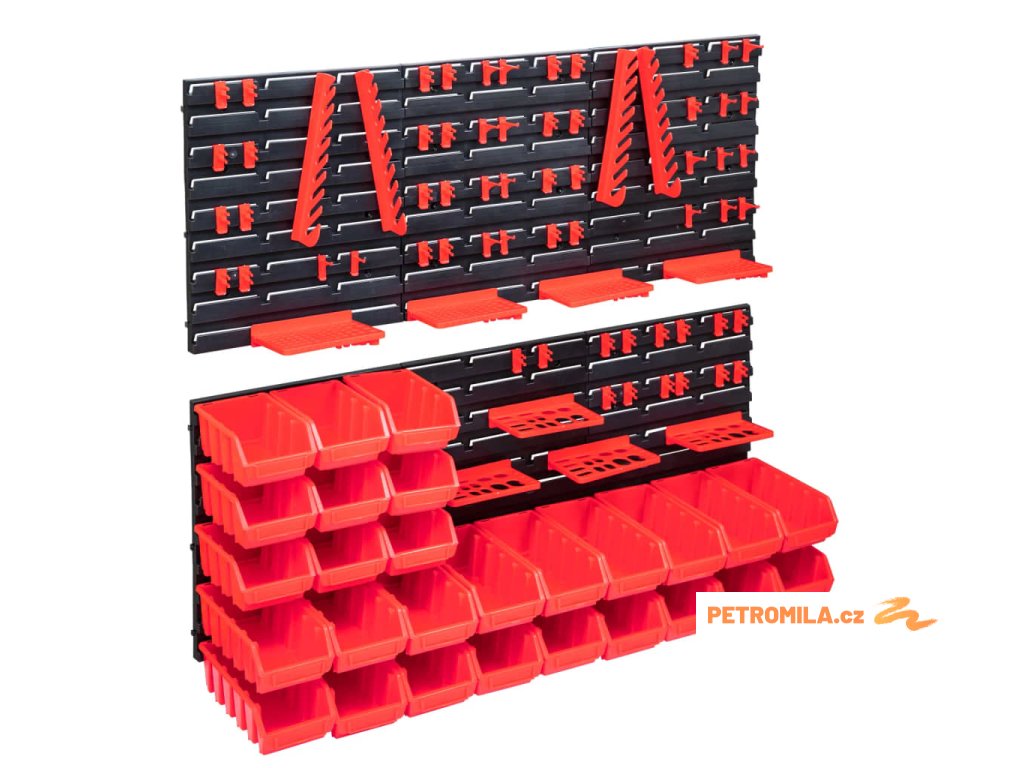 Tyto funkční panely se stohovatelnými boxy nabízí celou řadu možností pro ukládání malých součástek, jako jsou šrouby, hřebíky, matice, objímky, spojky apod. Do 6 pevných nástěnných panelů jsou připevněné držáky a upínače pro nejrůznější typy nářadí a 27 zásobníků, které si lze označit, abyste měli lepší přehled o jejich obsahu. Jednotlivé boxy můžete také samostatně vytahovat a naskládat je na sebe. Sadu panelů na nářadí je možné libovolně rozšiřovat a dá se snadno namontovat na stěnu garáže nebo kůlny. Soupravu skladovacích zásobníků si můžete přizpůsobit dle vlastních potřeb.