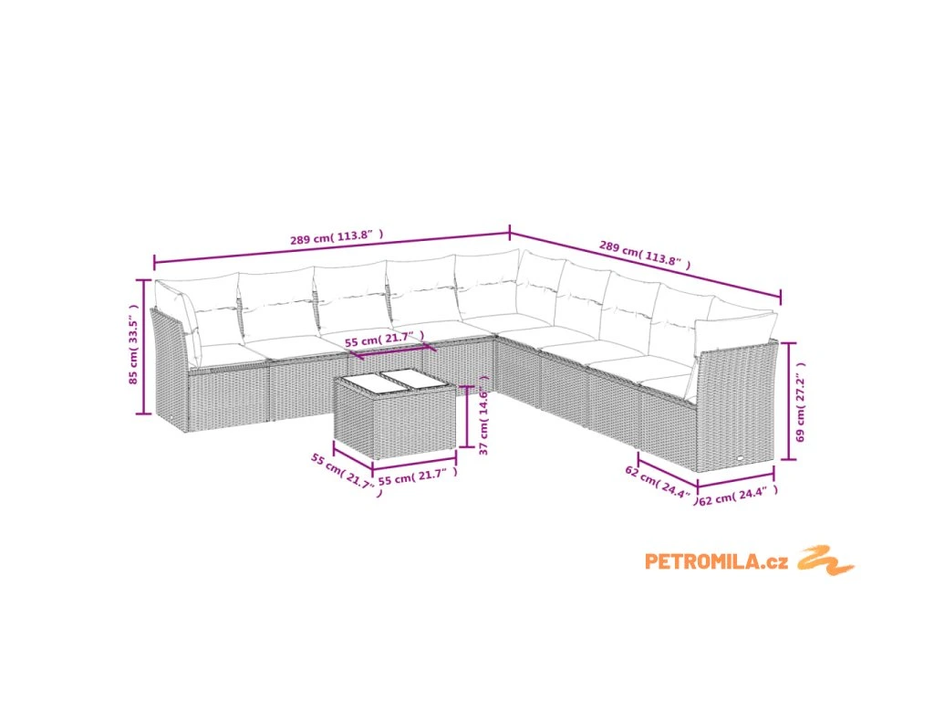 - Celkové rozměry pohovky: 289 x 289 x 69 cm (Š x H x V)