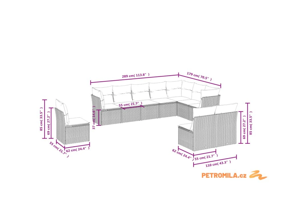 - Celkové rozměry 7místné pohovky: 289 x 179 x 69 cm (Š x H x V)