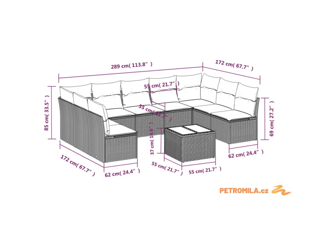 - Celkové rozměry pohovky: 289 x 172 x 69 cm (Š x H x V)