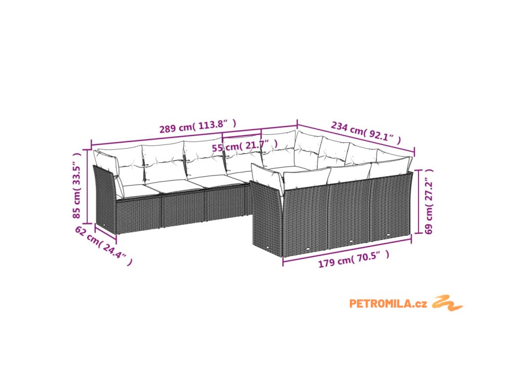 - Celkové rozměry pohovky: 289 x 234 x 69 cm (Š x H x V)