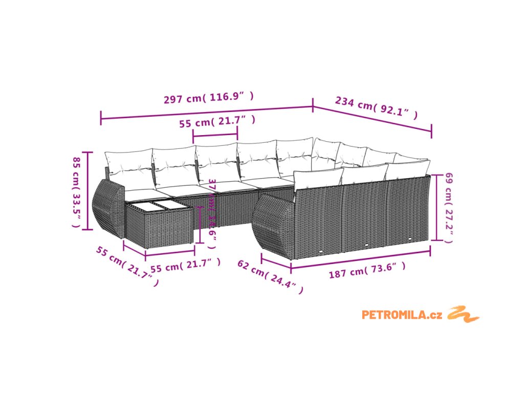 - Rozměry podušky za záda: 55 x 45 x 13 cm (D x Š x T)