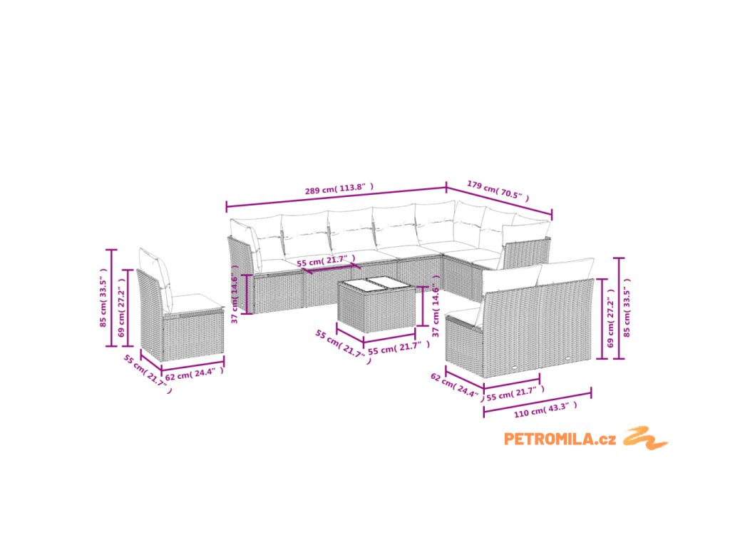 - Celkové rozměry 7místné pohovky: 289 x 179 x 69 cm (Š x H x V)