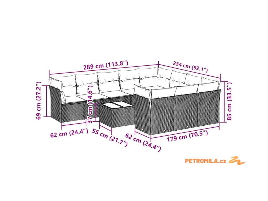 - Celkové rozměry pohovky: 289 x 234 x 69 cm (Š x H x V)