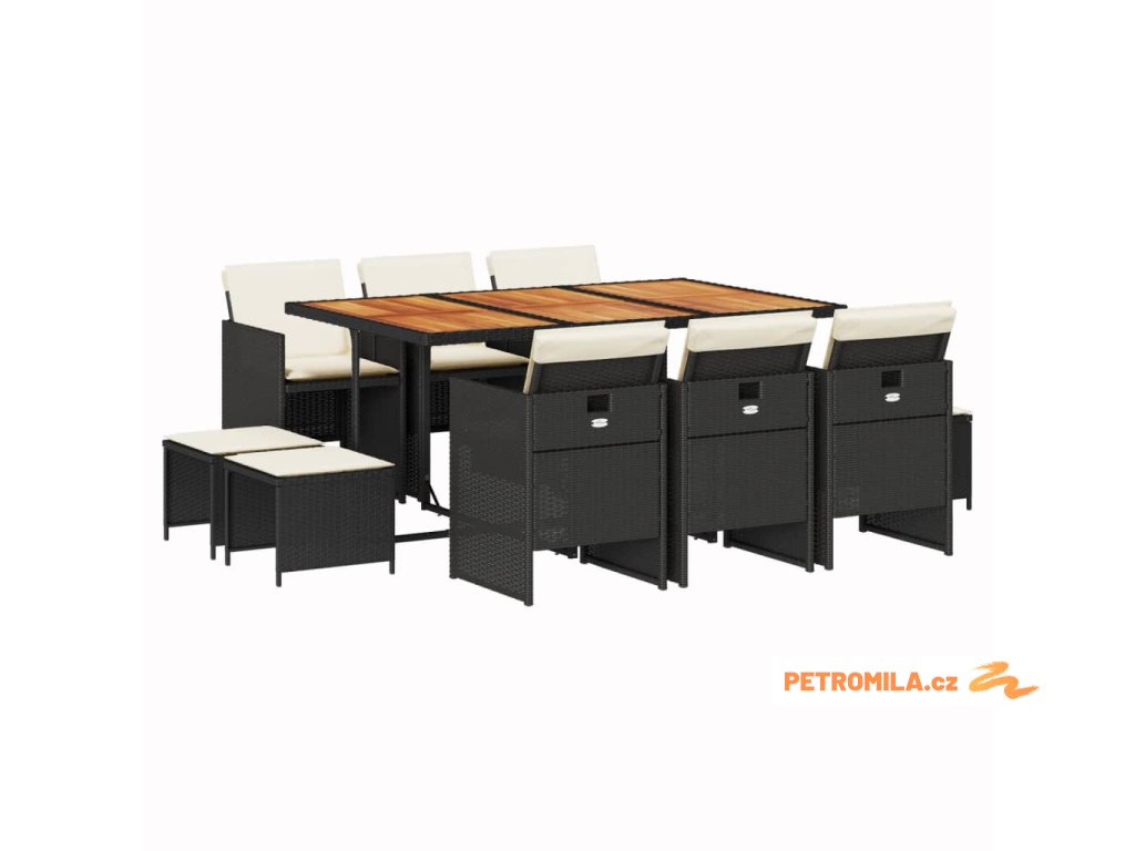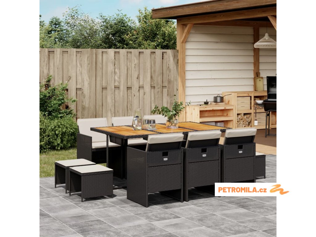11dílný zahradní jídelní set s poduškami černý polyratan