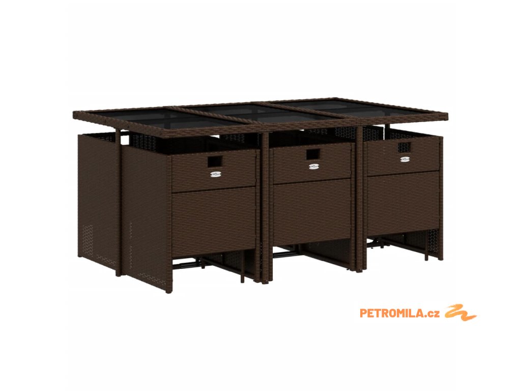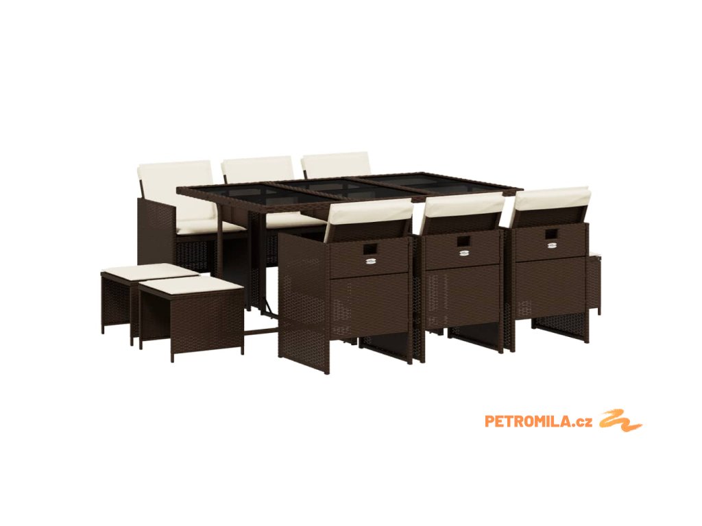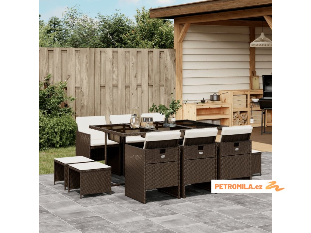 11dílný zahradní jídelní set s poduškami hnědý polyratan