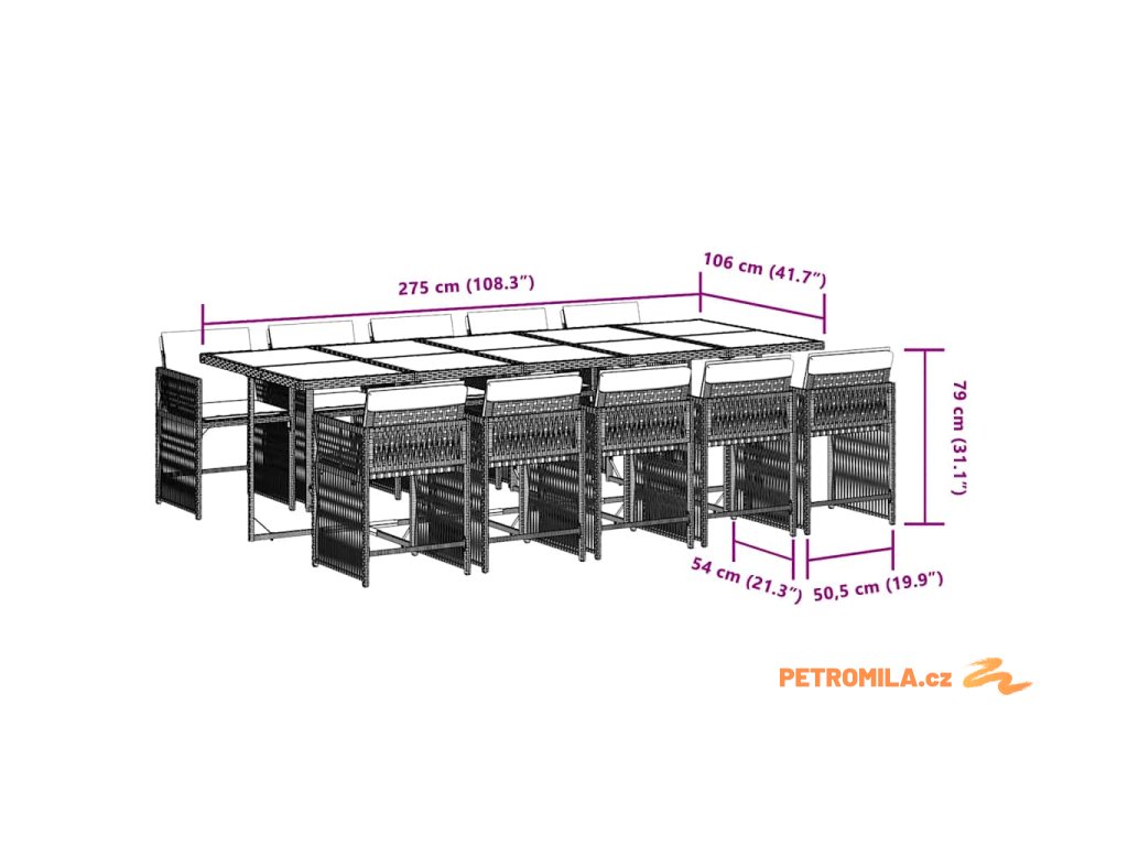 - Rozměry: 275 x 106 x 73 cm (D x Š x V)