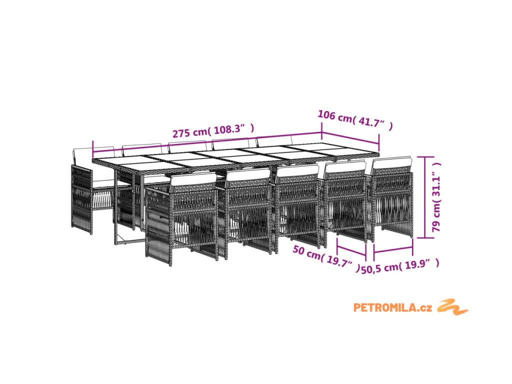 - Rozměry: 275 x 106 x 73 cm (D x Š x V)