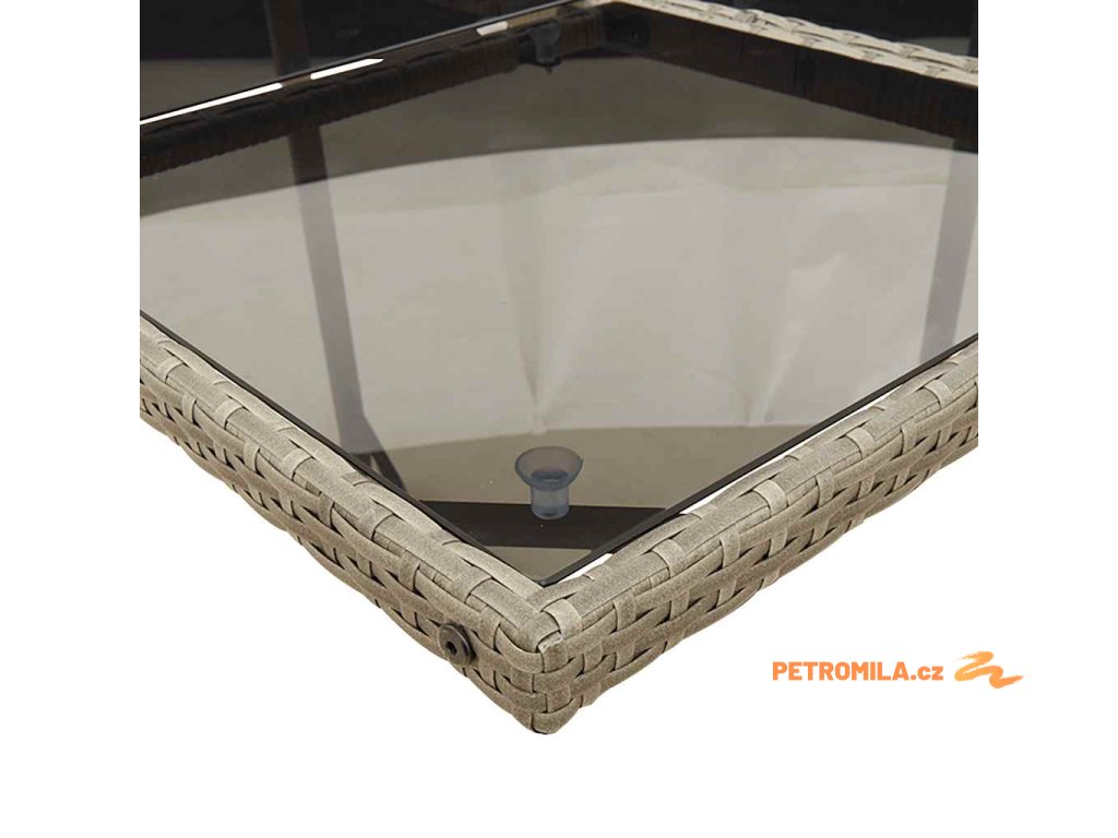 - Materiál: PE ratan, práškově lakovaná ocel, tvrzené sklo