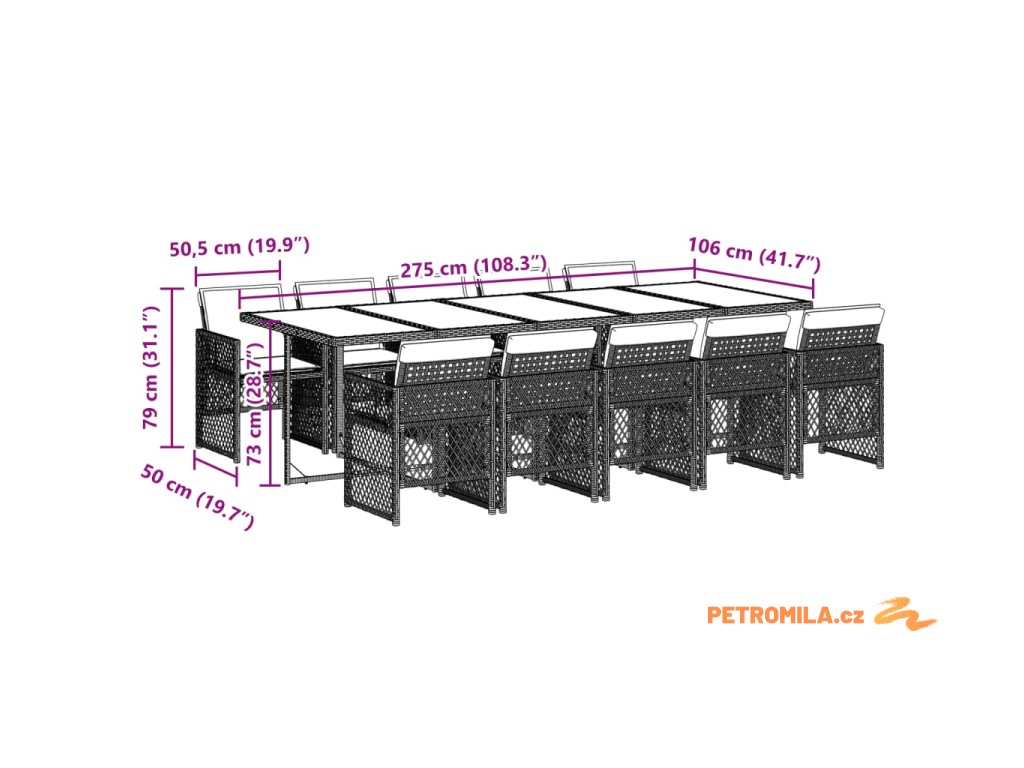 - Rozměry: 275 x 106 x 73 cm (D x Š x V)