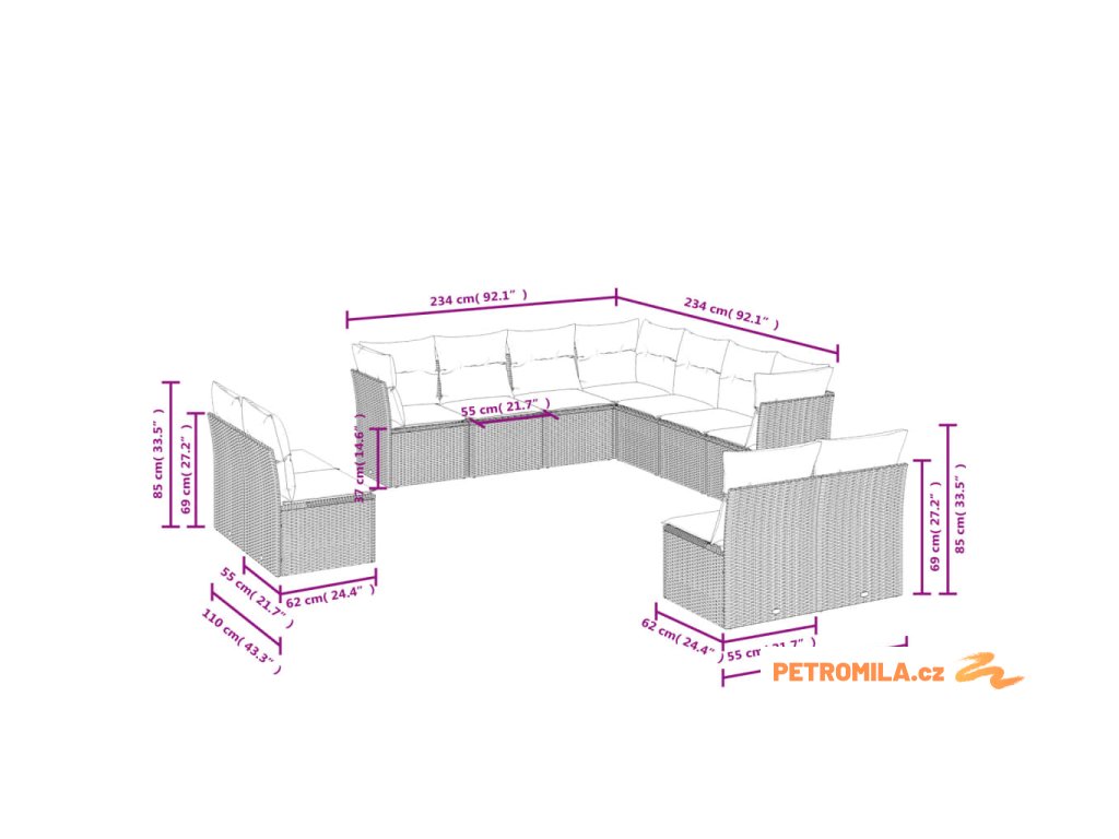 - Celkové rozměry 7místné pohovky: 234 x 234 x 69 cm (Š x H x V)