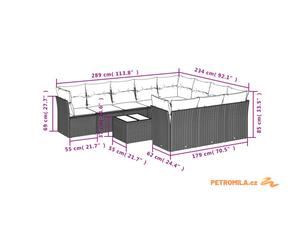 - Celkové rozměry pohovky: 289 x 234 x 69 cm (Š x H x V)