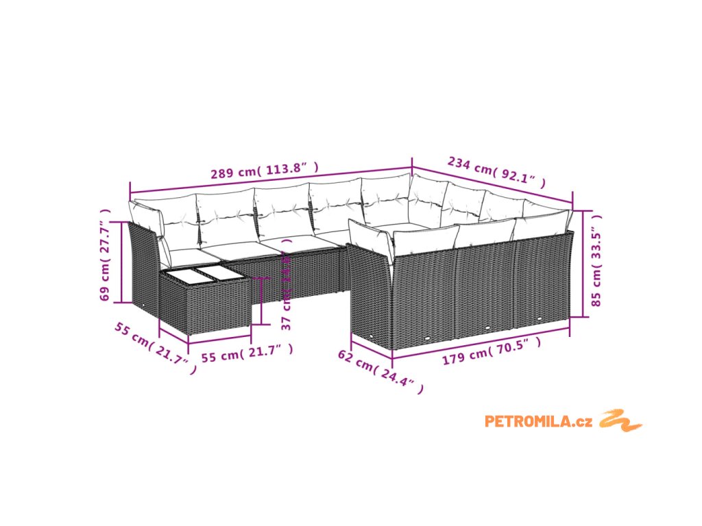 - Celkové rozměry pohovky: 289 x 234 x 69 cm (Š x H x V)