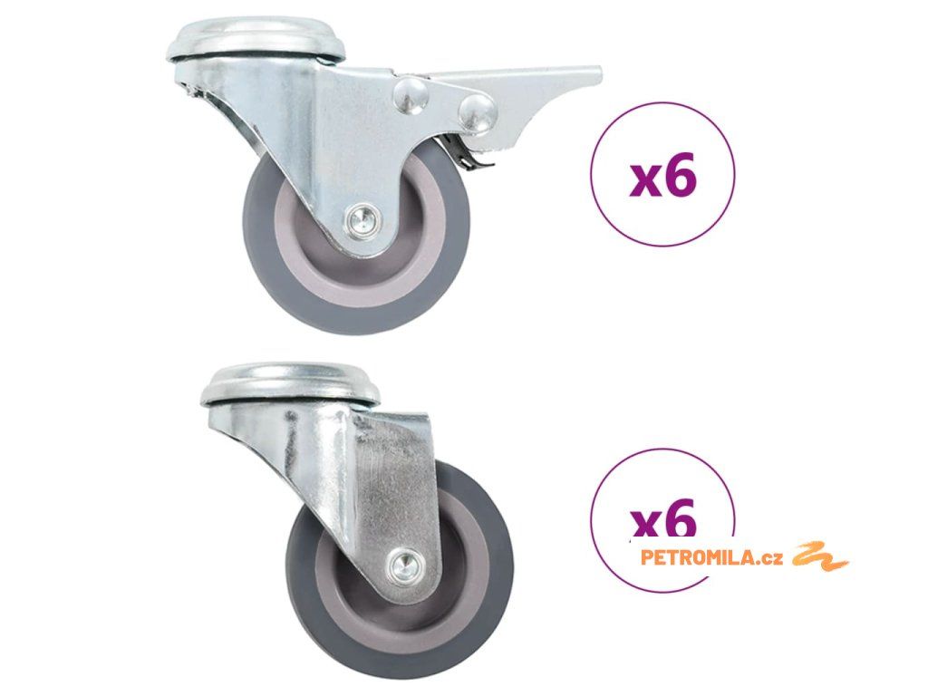 Balení obsahuje 6 otočných koleček s otvorem pro šroub a 6 otočných koleček s otvorem pro šroub a brzdou