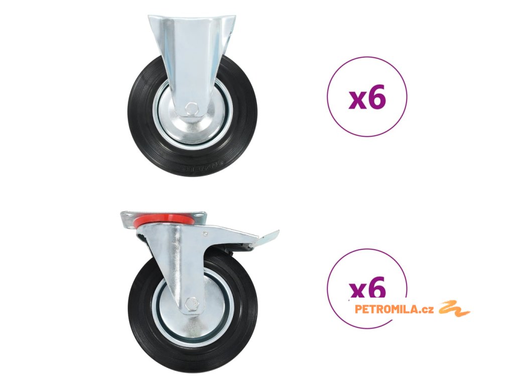 - Balení obsahuje 6 pevných koleček a 6 otočných koleček s brzdou.