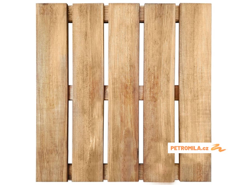 Terasové dlaždice jsou vyrobené z impregnovaného borového dřeva. Jedná se o velmi odolné dřevo, které nepodléhá hnilobě ani vlivům počasí. Překrásná kresba dřeva propůjčuje dlaždicím rustikální kouzlo a jedinečný, neopakovatelný vzhled. Balení obsahuje 12 terasových dlaždic.