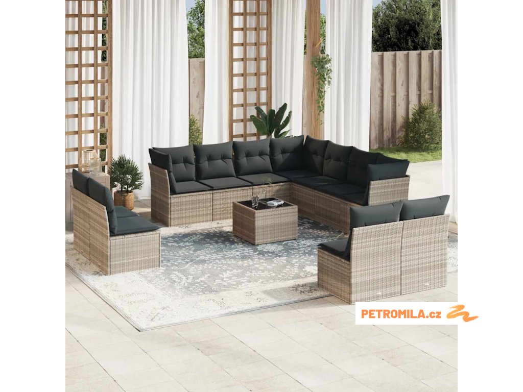 12dílná zahradní sedací souprava podušky světle šedá polyratan