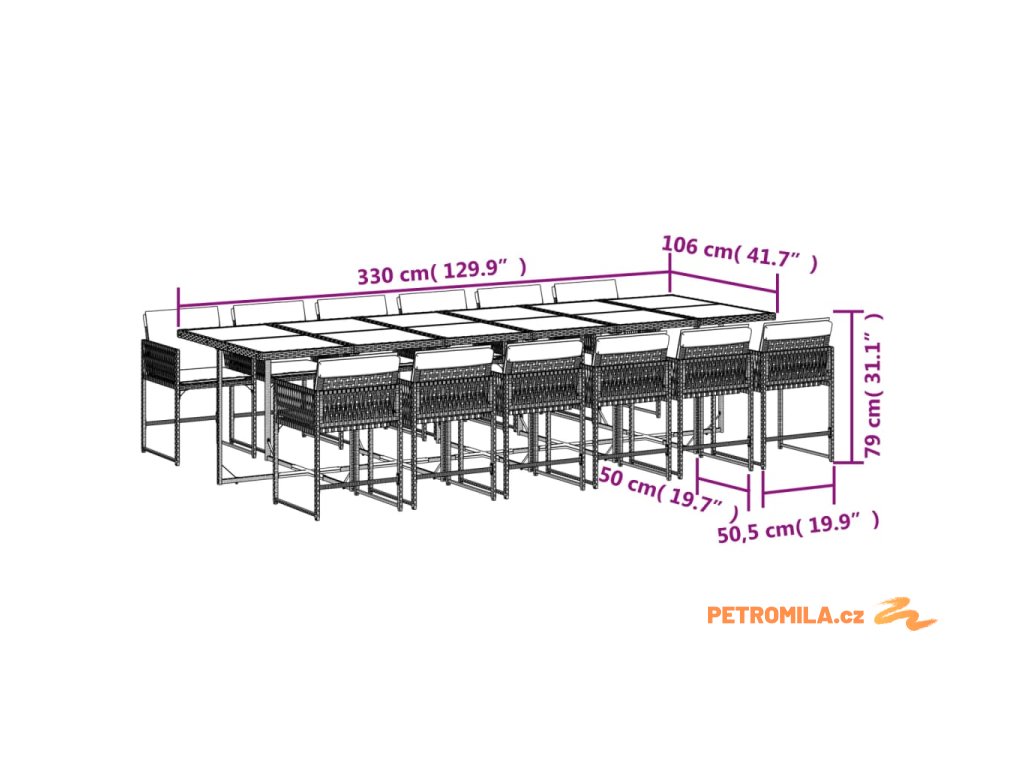 - Rozměry: 330 x 106 x 73 cm (D x Š x V)