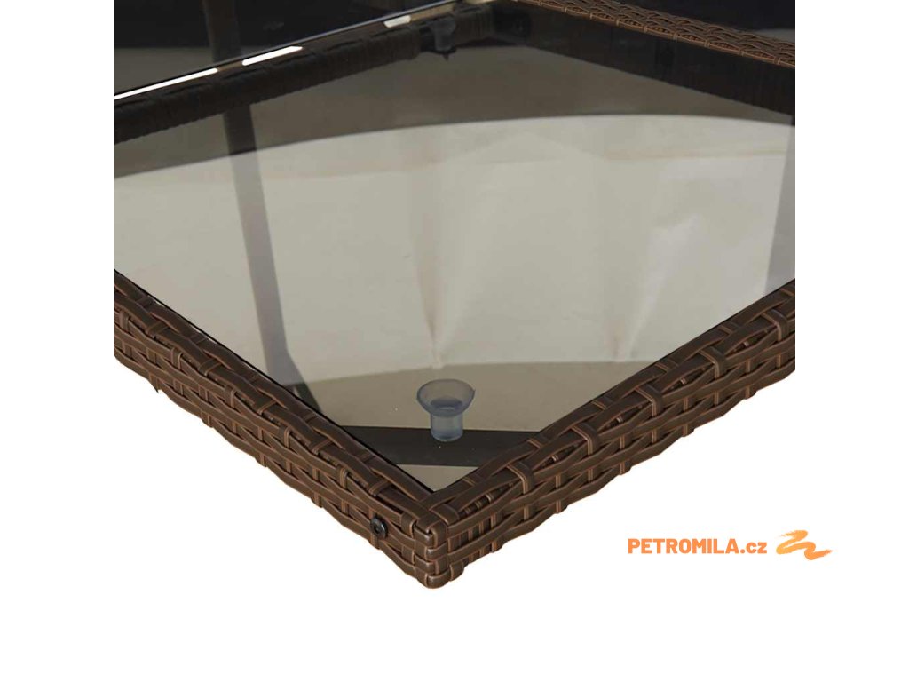 - Materiál: PE ratan, práškově lakovaná ocel, tvrzené sklo