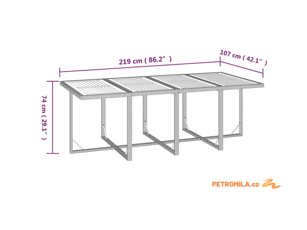 - Celkové rozměry stolu: 219 x 107 x 74 cm (D x Š x V)