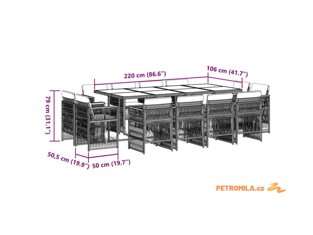 - Rozměry: 220 x 106 x 73 cm (D x Š x V)