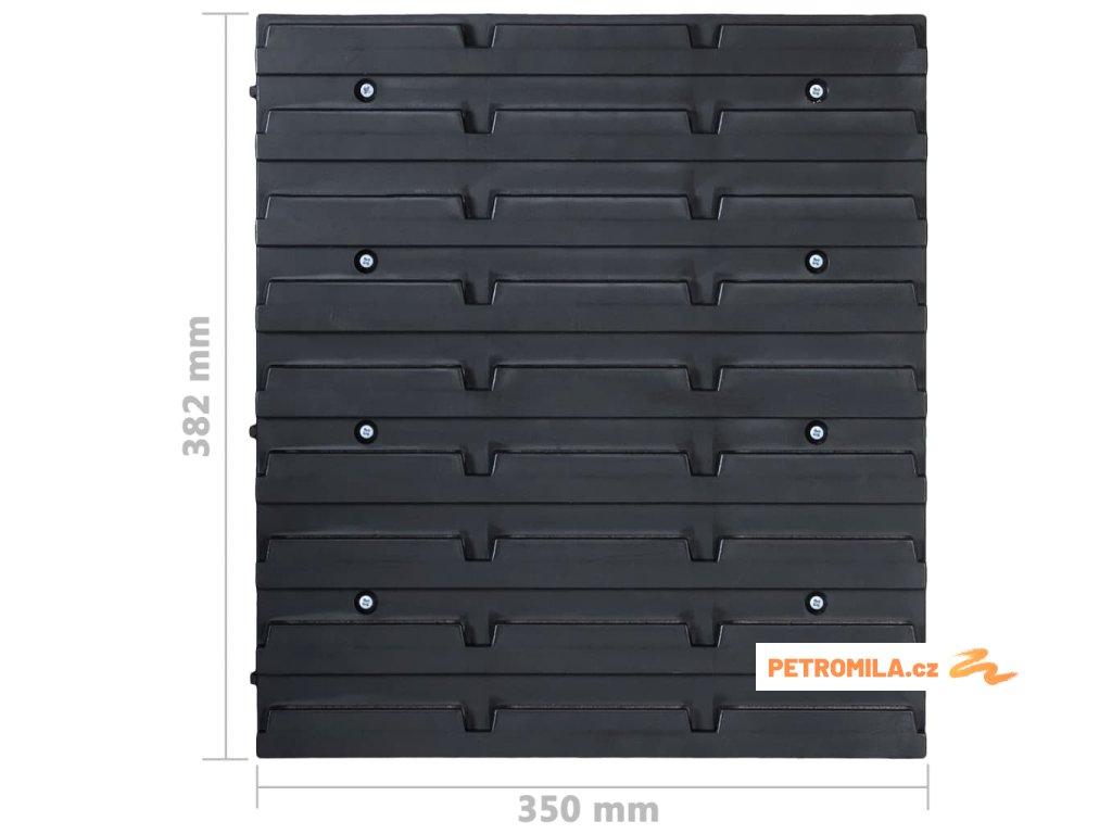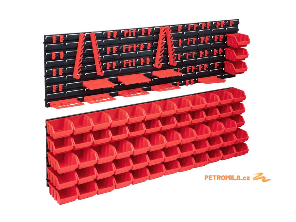Tyto funkční panely se stohovatelnými boxy nabízí celou řadu možností pro ukládání malých součástek, jako jsou šrouby, hřebíky, matice, objímky, spojky apod. Do 8 pevných nástěnných panelů jsou připevněné držáky a upínače pro nejrůznější typy nářadí a 63 zásobníků, které si lze označit, abyste měli lepší přehled o jejich obsahu. Jednotlivé boxy můžete také samostatně vytahovat a naskládat je na sebe. Sadu panelů na nářadí je možné libovolně rozšiřovat a dá se snadno namontovat na stěnu garáže nebo kůlny. Soupravu skladovacích zásobníků si můžete přizpůsobit dle vlastních potřeb.