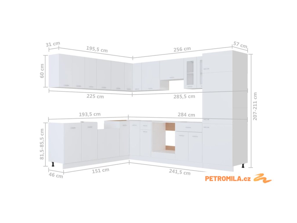 - 1 x Rohová spodní skříňka: 75,5 x 75,5 x 80,5 cm (Š x H x V)
