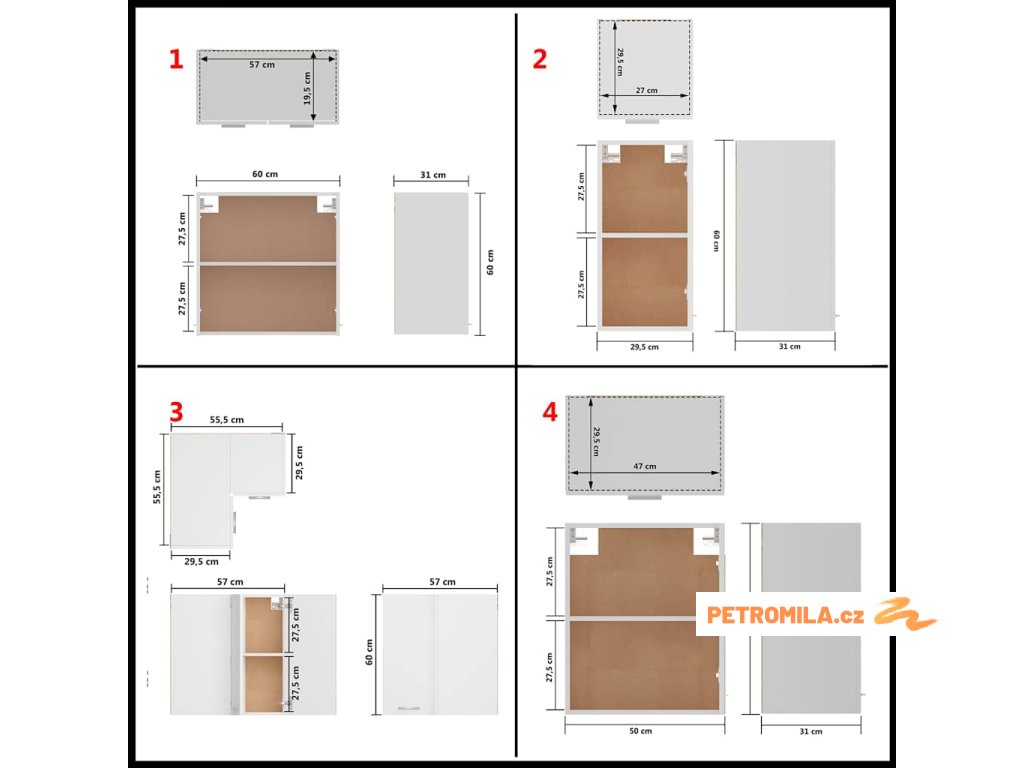 - 1 x Závěsná rohová skříňka: 57 x 57 x 60 cm (Š x H x V)