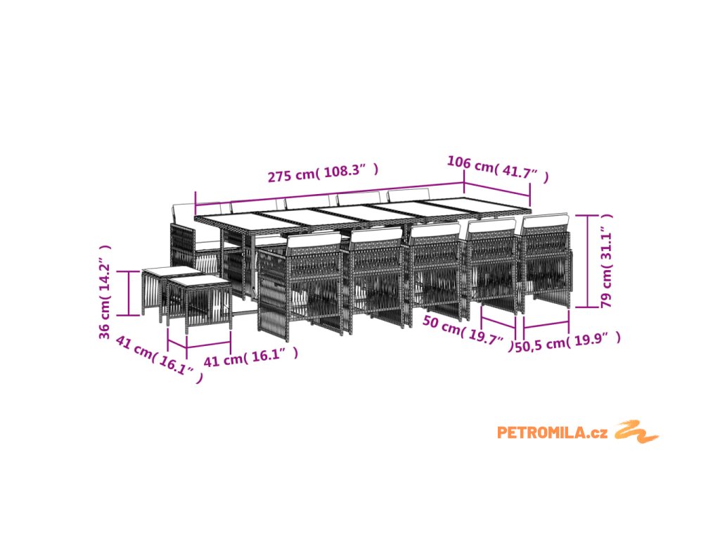 - Rozměry: 275 x 106 x 73 cm (D x Š x V)