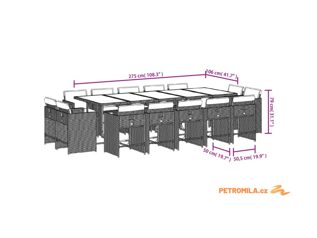 - Rozměry: 275 x 106 x 73 cm (D x Š x V)