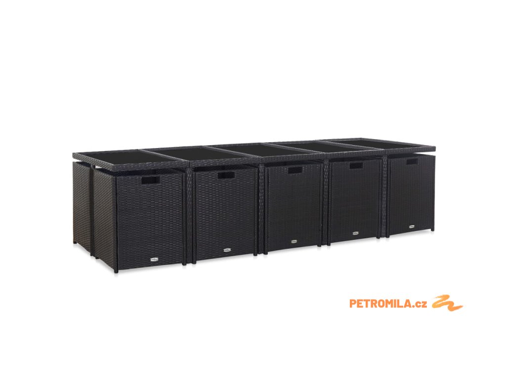 Balení obsahuje 1 stůl se skleněnou deskou, 10 ratanových židlí, 4 stoličky a 24 odnímatelných podušek.