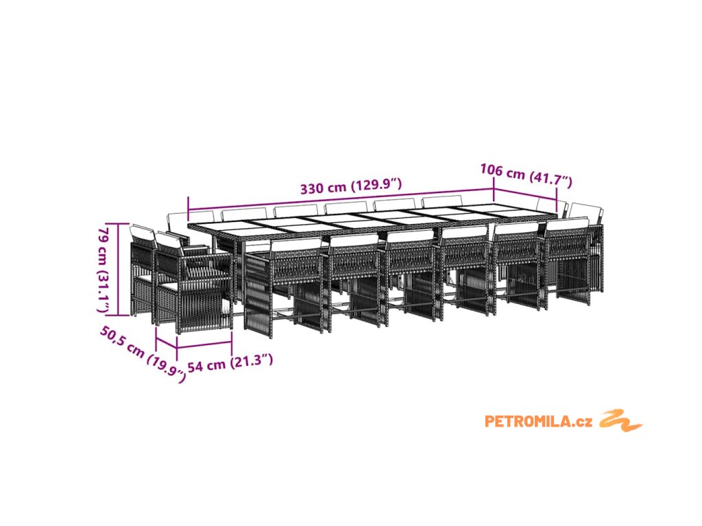 - Rozměry: 330 x 106 x 73 cm (D x Š x V)