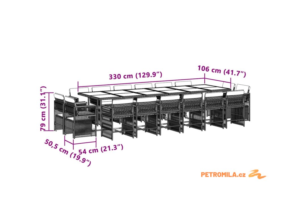 - Rozměry: 330 x 106 x 73 cm (D x Š x V)