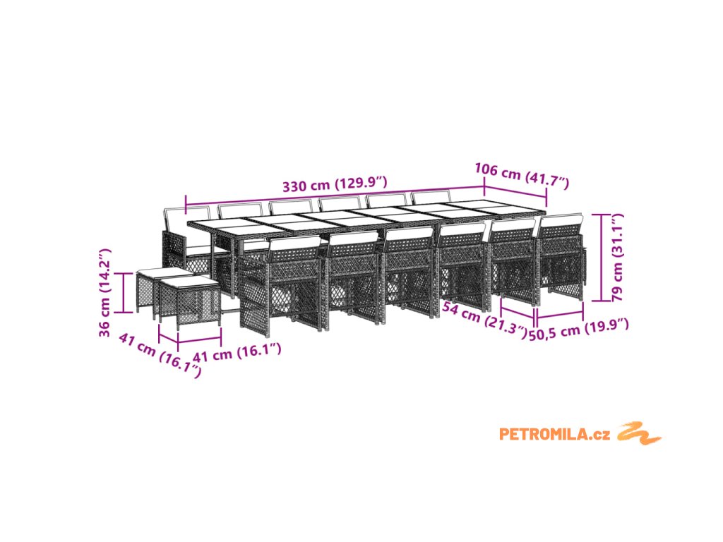 - Rozměry: 330 x 106 x 73 cm (D x Š x V)