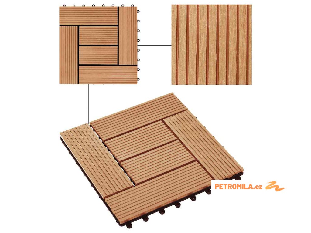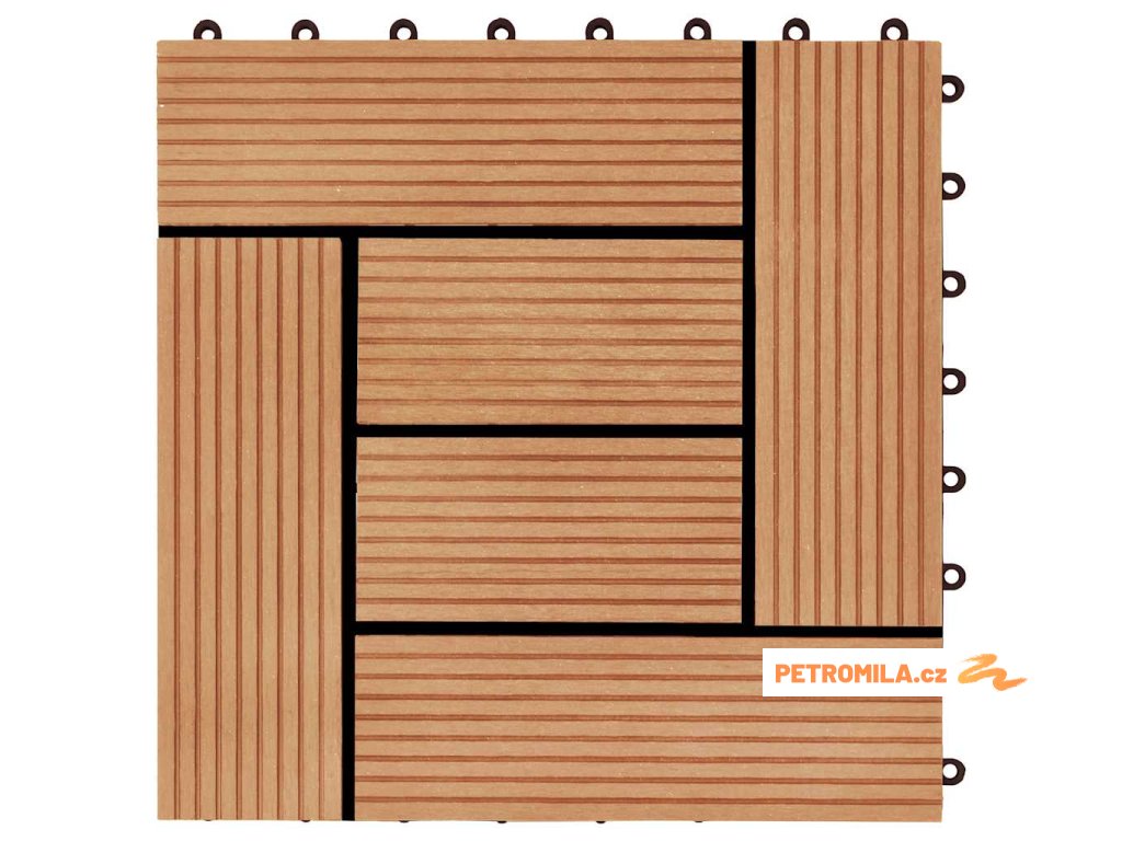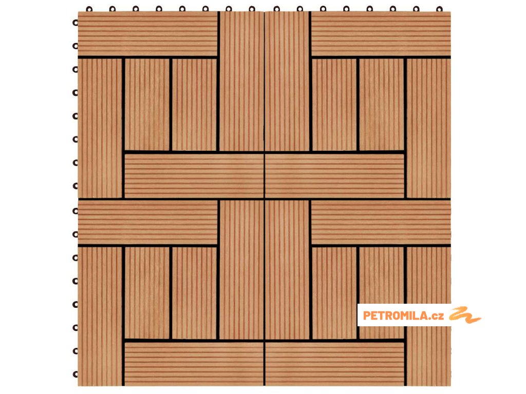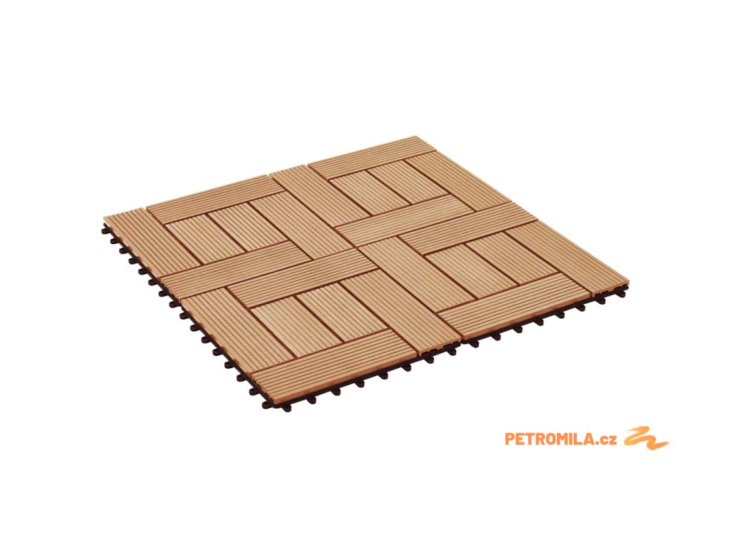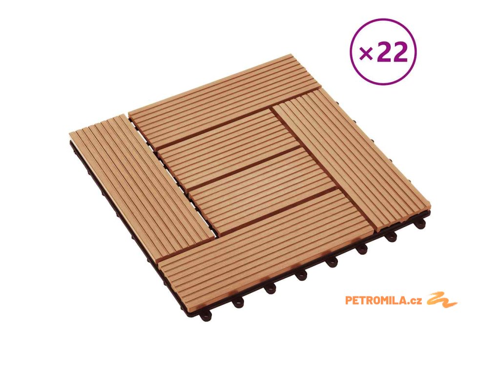 Tuto sadu terasových dlaždic z dřevoplastu tvoří 22 kusů samostatných dlaždic o velikosti 30 x 30 cm, které dohromady pokryjí celkový povrch o rozloze 2 metry čtverečné. Jsou ideální volbou na dvorky a balkony, k bazénu nebo k vířivce anebo třeba do koupelen.