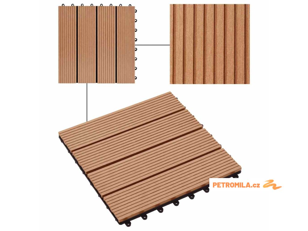 Tuto sadu terasových dlaždic z dřevoplastu tvoří 22 kusů samostatných dlaždic o velikosti 30 x 30 cm, které dohromady pokryjí celkový povrch o rozloze 2 metry čtverečné. Jsou ideální volbou na dvorky a balkony, k bazénu nebo k vířivce anebo třeba do koupelen.
