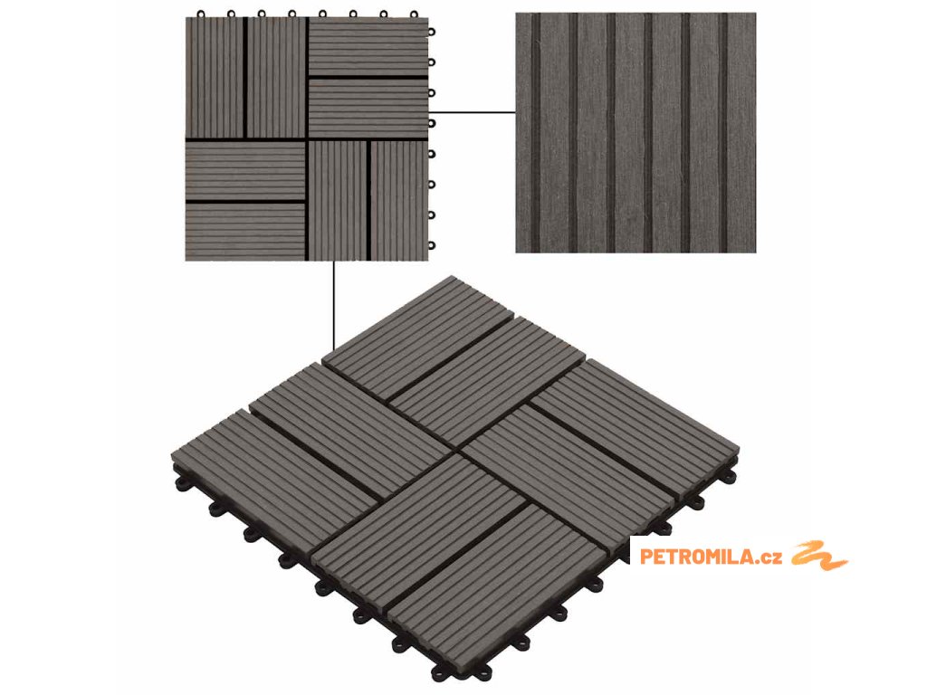 Tuto sadu terasových dlaždic z dřevoplastu tvoří 22 kusů samostatných dlaždic o velikosti 30 x 30 cm, které dohromady pokryjí celkový povrch o rozloze 2 metry čtverečné. Jsou ideální volbou na dvorky a balkony, k bazénu nebo k vířivce anebo třeba do koupelen.