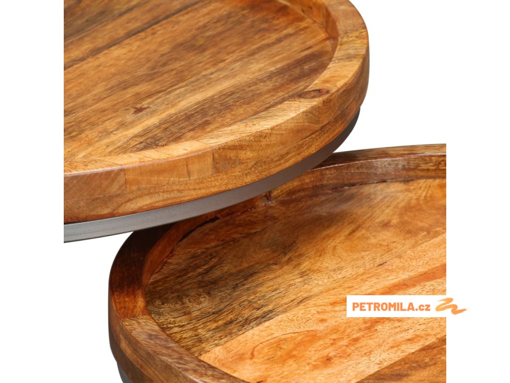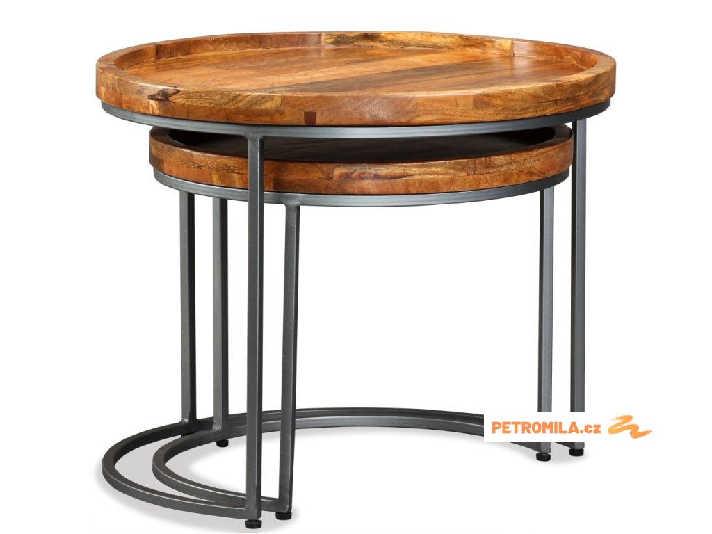 Naše odkládací stolky jsou ručně vyrobené z masivního mangovníkového dřeva, které je stabilní, odolné a krásné. Řemeslné zpracování navíc dokresluje krásný retro design. Každý krok výrobního procesu je prováděný s největší péčí, ať už se jedná o leštění, natírání nebo lakování. Řemeslné zpracování a krásná kresba dřeva dává každému kusu nábytku jedinečný charakter, kterým se odlišuje od všech ostatních. Rám stolků je vyrobený z tepaného železa s dlouhou životností, který zaručuje neobyčejnou stabilitu stolku. Balení obsahuje 2 odkládací stolky s různými rozměry. Menší stolek lze zasunout pod ten větší, aby zbytečně nezabíral místo.