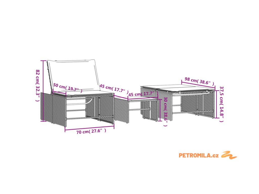 - Rozměry každého modulárního lehátka: 70 x 98 x 40/57/71/82 cm (Š x H x V)