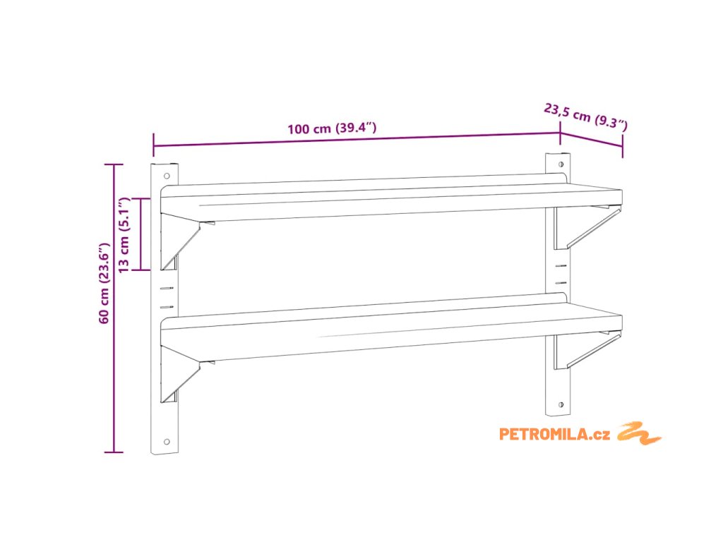 - Rozměry (každé police): 100 x 23,5 cm (D x Š)