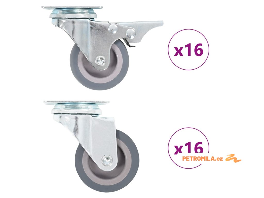 Balení obsahuje 16 otočných koleček a 16 otočných koleček s brzdou