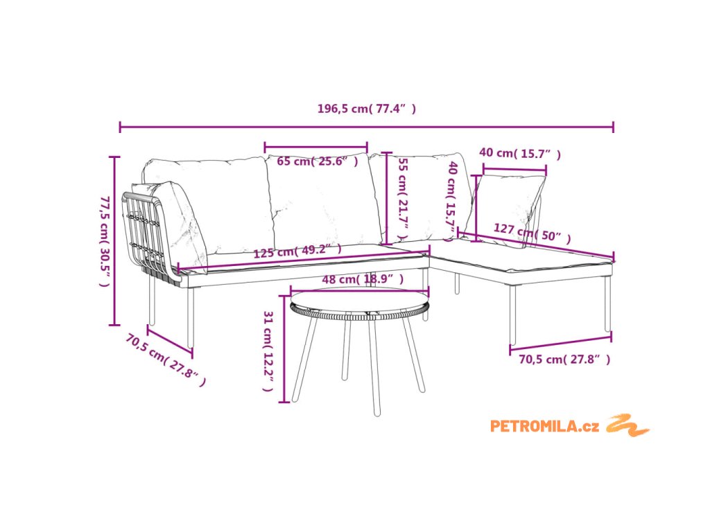 - Rozměry pohovky ve tvaru L (l): 127 x 70,5 x 77,5 cm (Š x H x V)