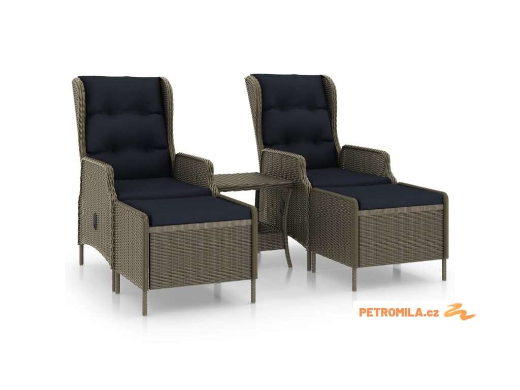 Zahradní polohovací křesla i čajový stolek mají rám z práškově lakované oceli opletený kulatým PE ratanem, takže jsou odolné a snadno se čistí. Hustě polstrované podušky vám při odpočinku zajistí zvýšené pohodlí. Jejich potahy jsou opatřené zipy, aby se daly sejmout a oprat. Mechanismus s plynovým pístem vám umožňuje sklopit opěradlo do preferované pozice. Stiskem bočního tlačítka ho můžete nastavit až do příjemné polohy vleže. Židle je jako stvořená pro relaxaci, zvlášť když si položíte nohy na ladící podnožku. Navíc si ji můžete postavit, kam se vám zlíbí. Robustní stolní deska vám skvěle poslouží k odkládání či vystavování nejrůznějších věcí. Sedací souprava má lehkou konstrukci, lze ji tedy bez námahy přesouvat z místa na místo.