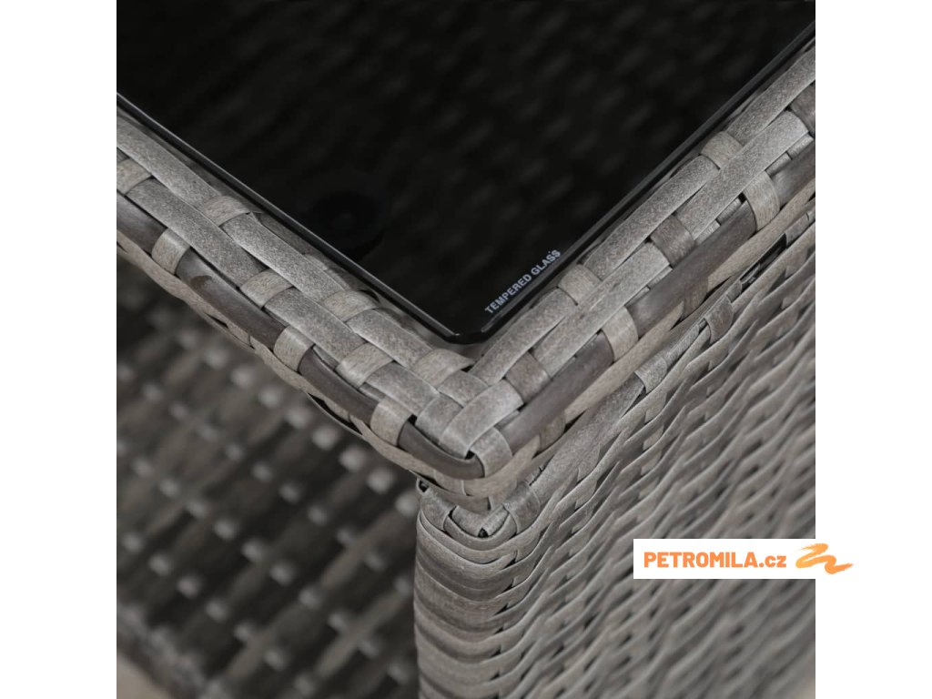 - Materiál: PE ratan + ocelový rám s práškovým nástřikem + skleněná stolní deska