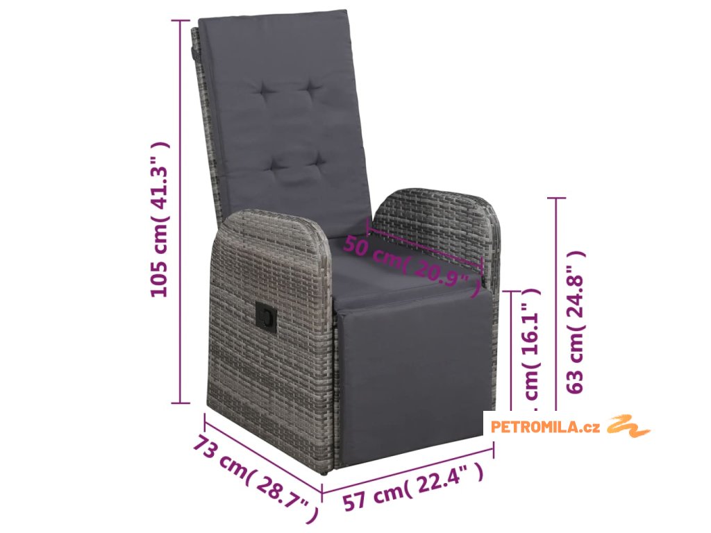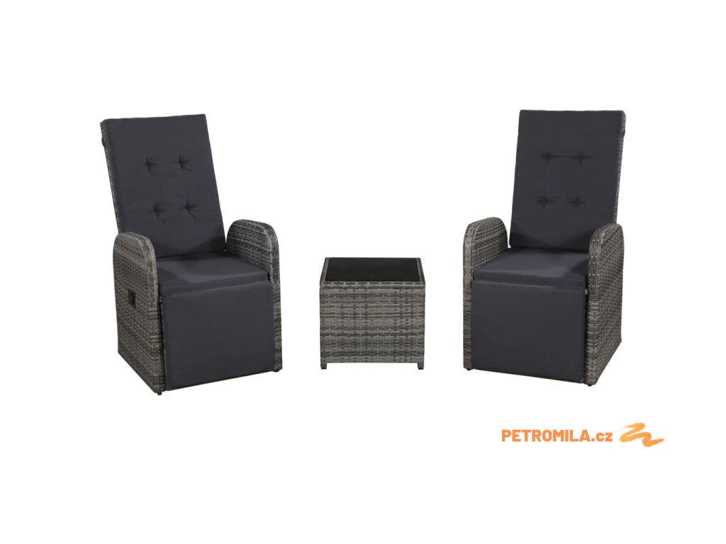 Nastavitelné opěradlo a podnožka polohovacích křesel vám umožní se pohodlně usadit a zcela se uvolnit. Tato sada venkovního nábytku je vyrobená z PE ratanu, který je odolný vůči klimatickým vlivům, snadno čistí, je velmi trvanlivý a vhodný pro každodenní použití. Ocelový rám s práškovým nástřikem je zárukou, že jsou křesla i stůl velmi pevné a odolné. Stůl má skleněnou horní desku. Polohovací židle vám poskytnou veškeré pohodlí, jaké si můžete přát. Opěradlo lze sklopit zatažením za tlačítko na boční straně křesla. Lehká konstrukce umožňuje snadné přesouvání nábytku. Součástí setu jsou rovněž mimořádně pohodlné, silně polstrované podušky na sedáky, jež se postarají o vaše naprosté pohodlí. Polyesterové potahy jsou nenáročné na údržbu a lze je také sejmout a oprat.