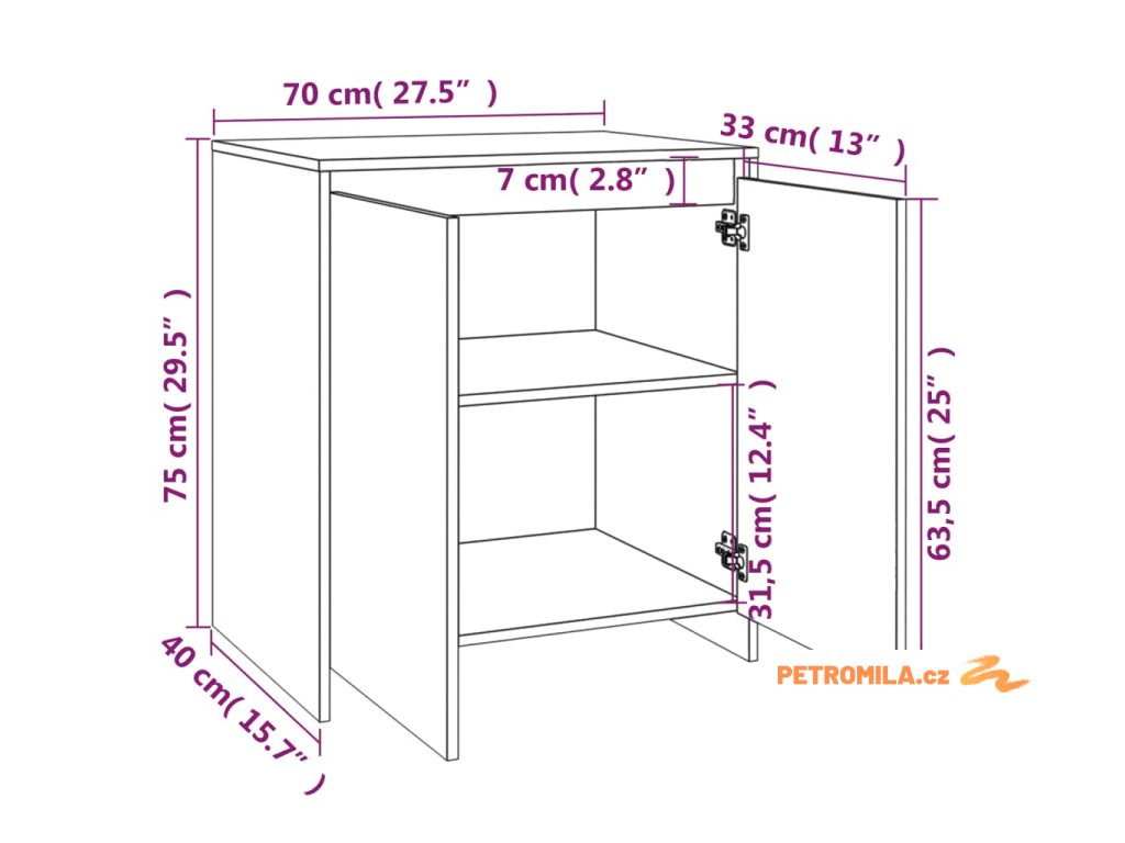 - Rozměry příborníku s dvířky: 70 x 40 x 75 cm (Š x H x V)