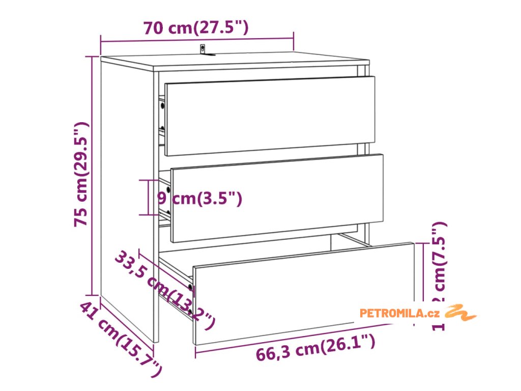 - Rozměry příborníku se zásuvkami: 70 x 41 x 75 cm (Š x H x V)