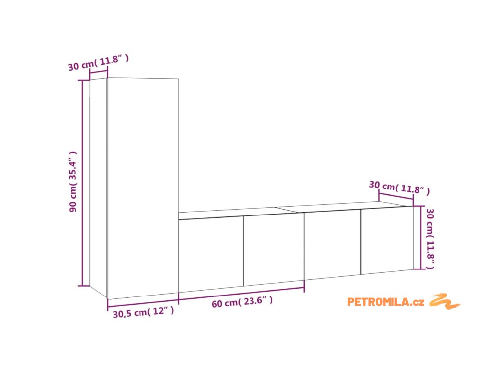 - 1x TV skříňka: 30,5 x 30 x 90 cm (Š x H x V)