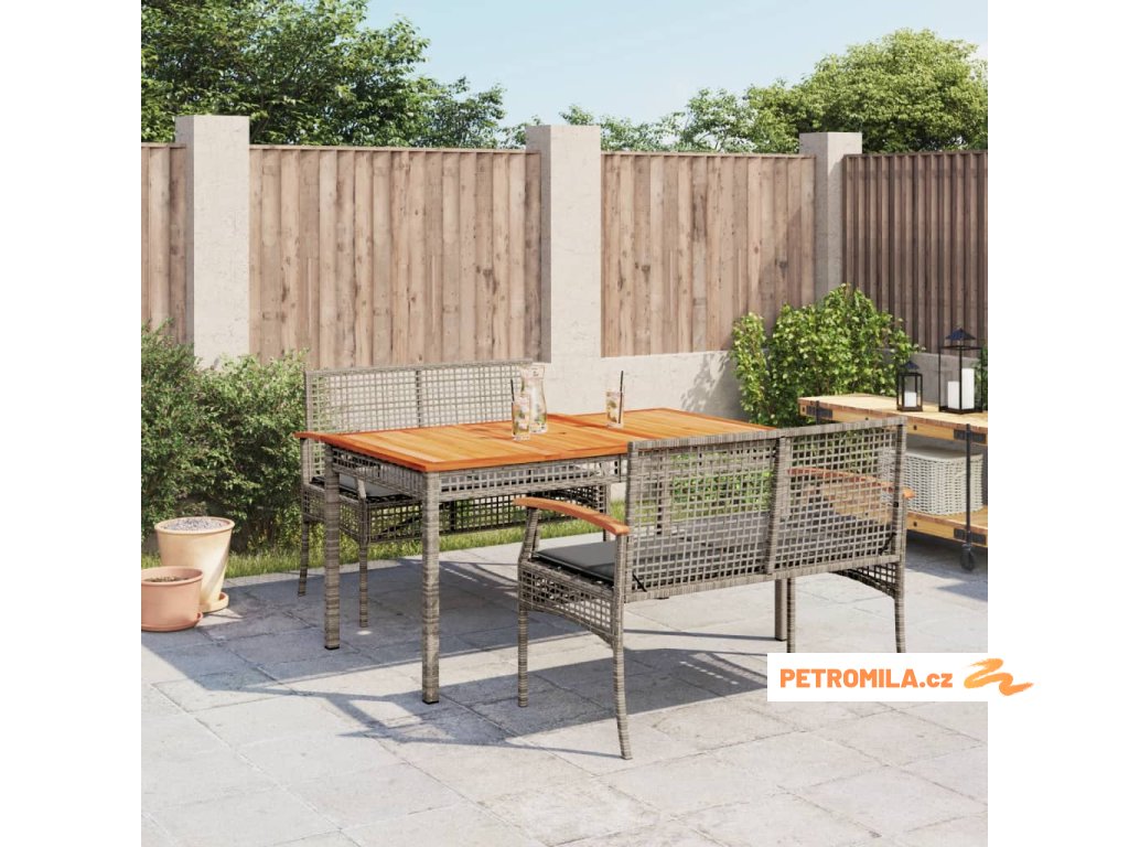 - Materiál: PE ratan, práškově lakovaná ocel, masivní akáciové dřevo s olejovou povrchovou úpravou