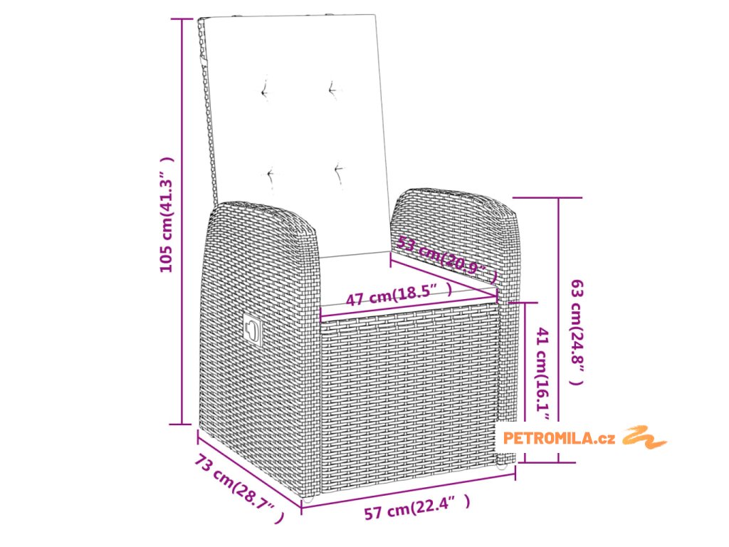 - Rozměry křesla (nesklopeného): 57 x 73 x 105 cm (Š x H x V)